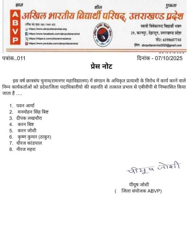 यह जानकारी जिला संयोजक पीयूष जोशी द्वारा हस्ताक्षरित ABVP के प्रेस नोट संख्या 011 (दिनांक 07 अक्टूबर 2025) में दी गई है।